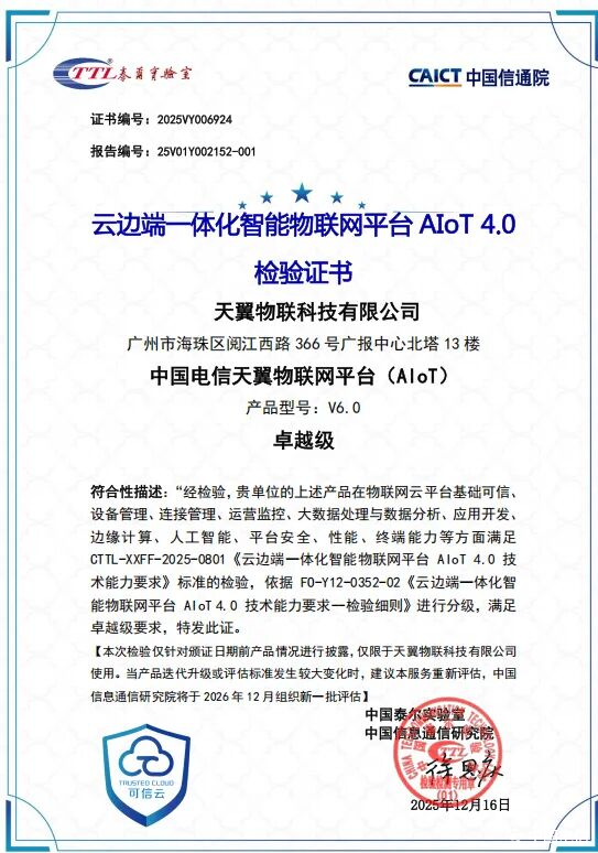 作为国内最权威的AIoT平台评估体系,中国信通院“智能物联网4.0”评估,重点围绕平台能力建设成熟度、物联网人工智能服务和智能体应用能力、场景化服务能力等开展,细分指标超千项,评估结果分基础、增强及卓越级,全面衡量平台技术成熟度、应用成效与行业竞争力,为政府支撑、行业规范、用户选型和价值评价提供重要参考。此次评估,天翼物联网平台(AIoT)在云边端一体化、数字孪生、人工智能服务成熟度及多模态智能感知融合中获卓越级评价。
