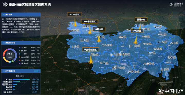 在重庆合川,天翼物联打造智慧灌区民生工程,通过灌区“一张图”,实现灌区内2座水源水库、84公里输配水管网的实时监测与智能调度,保障合川区二郎镇、燕窝镇9个行政村超2000户农户超1.2万亩农田的精准灌溉用水,通过水库雨水情分析、旱情AI模型分析、视频监控和量测水等能力,实现配水调度执行率提升至95%以上,在确保农作物“喝上及时水”的同时,助力农民增产增收,为乡村振兴注入强劲数字动能。